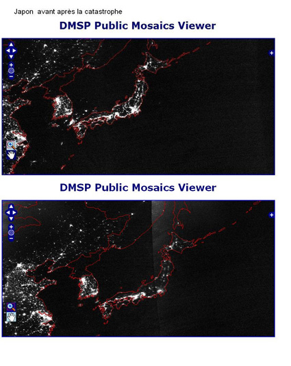 La catastrophe ayant affecté un pays « développé » et surconsommateur d’électricité, ce sont sans doute les images de nuit du programme satellitaire de météorologie de la défense américaine (DMSP : Defense Meteorological Satellite Program) qui en montrent le mieux l’impact, en donnant à voir la baisse des « lumières de la ville ». (http://mapserver.ngdc.noaa.gov/cgi-...)