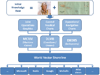 * Pour celles et ceux qui ne parlent pas couramment le Rousselin, voici une traduction approximative : « Les cartes des services hydrographiques et océanographiques de la marine (SHOM) sont justes, le problème c’est la base vectorielle mondiale du littoral, distribué par le SHOM, en provenance de la National Oceanic and Atmospheric Administration (NOAA), qui le tient de l’agence cartographique militaire des États-Unis (la NGA), qui l’a fait avec d’anciennes bases de données militaires générales, qui a été numérisé sur de vieilles cartes aéronautiques au 1/250 000, qui ont été renseignées à partir des indications des pilotes de chasse américain de la deuxième guerre mondiale, (comme celui qui est devenu le héros de la série télévisée « Les têtes brûlées »), voir plus anciennes encore » mais le schéma est encore plus facile à comprendre !
