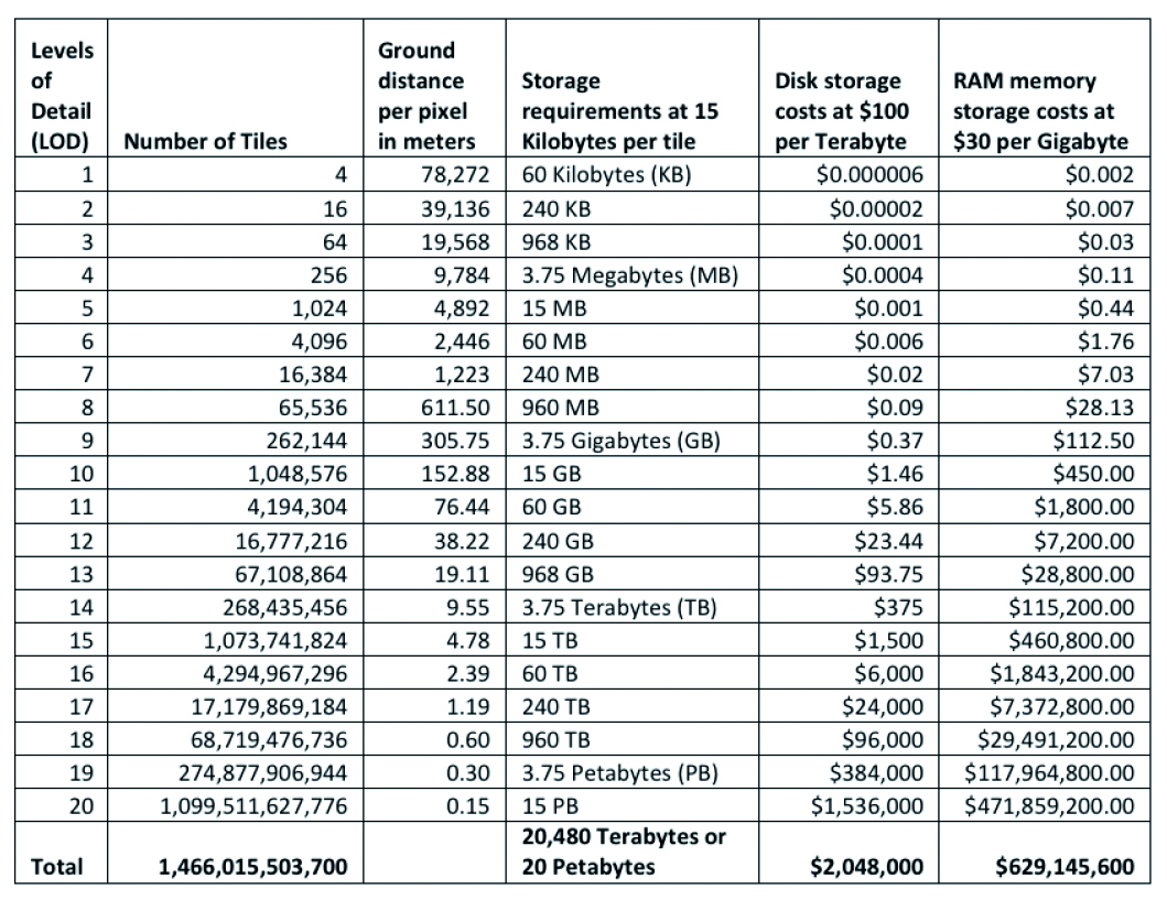 Pour Mike Peterson, nous sommes dans l’ère du tuilage en matière de cartographie sur Internet. À ses yeux, c’est l’une des deux innovations majeures apportées par Google Maps lors de son lancement, l’autre étant l’utilisation d’AJAX. « Le tuilage d’images a été utilisé dès les premiers temps du Web afin d’accélérer la mise à disposition d’images. Car les images demandent plus d’espace de stockage et sont donc plus lentes à télécharger que des éléments textuels. Une des solutions consiste à diviser l’image en petits ensembles, ou tuiles, puis à faire circuler ces derniers individuellement sur Internet. Ces fichiers plus petits circulent plus vite car chacun peut prendre un chemin différent pour atteindre l’ordinateur de destination. Du côté du récepteur, les tuiles sont réassemblées à la bonne place sur la page Web. Avec une connexion Internet moyenne, tout cela se passe si vite que l’utilisateur ne se rend même pas compte que l’image a été divisée. Les tuiles sont cependant visibles lorsque les connexions sont lentes. Toutes les tuiles sont des fichiers de 256 pixels par 256 pixels, et nécessitent environ 15 Ko pour être stockées en format PNG. » Mike Peterson a réalisé un tableau (en ligne sur notre site) qui montre le nombre de tuiles nécessaires pour une couverture mondiale organisée en vingt niveaux de zooms : Il faut environ 1 trillion de tuiles (1 million de millions), ce qui correspond à quelque 20 pétaoctets (ou 20 480 terraoctets) d’espace de stockage. « Aucun ordinateur n’a une telle capacité de stockage. » Pour calculer le coût d’un tel stockage, Mike Peterson se base sur un tarif moyen de 100 US $ par terraoctet, un prix qui ne comprend ni l’infrastructure hébergeant les disques, ni les connexions avec les ordinateurs. Le monde entier en vingt niveaux de zooms coûte donc autour de 629 millions US $ à stocker (457 millions d’euros).